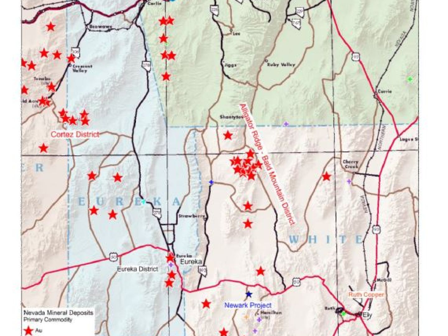 The Newark Gold Project is located at the southern end of the Battle Mountain-Eureka (Cortez) gold trend where intersected by the projection of the Alligator Ridge gold trend. The project is located 72.4 km (45 miles) west of Ely, Nevada in central White Pine County, 40 km south of of the past-producing Alligator Ridge Mine, 12 km north of the Mt. Hamilton Gold Project and 20 km east of the Pan Gold Mine.